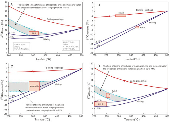 Fortunately, based on the evolution of the fluid’s oxygen isotope compositions, it is possible to evaluate the boiling and fluid mixing and their relative importance [27,29]. Thus, to test the hypotheses of fluid mixing, boiling, and some combination of them, we calculated the oxygen isotope compositions of the hematite, magnetite, quartz, and calcite that were precipitated by each mechanism as a function of temperature, using the method suggested by Wagner et al. [27,29]. Since experimental research on liquid–vapor isotope partitioning in the H2O–NaCl system is limited to conditions below the critical point of pure water [43,44], it is impossible to adequately model the boiling of the temperature–composition space relevant to Taochong. On the basis of boiling models for low-salinity fluids [29,45], it can be expected that boiling would generate a gradual increase in the δ18O values of the mineral deposited by residue liquids. This may be due to the preferential partitioning of the lighter δ16O isotope into the vapor phase [46], resulting in residual brine increasingly rich in δ18O. In addition, since the enthalpy is transferred from the liquid to the vapor required to maintain the enthalpy balance, the cooling of the residual brine enhances the effect of the precipitated minerals being rich in δ18O [27]. Therefore, the main effect of boiling on the δ18O values of the precipitated minerals is roughly similar to the effect of fluid cooling and can thus be simulated by the latter [27,29].
