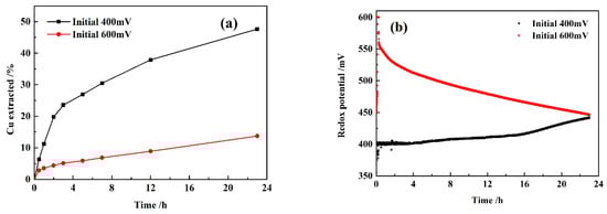 Figure 3. Cu leaching rate (a) and real-time redox potential data of the leaching solution (b), with initial redox potentials of 400 mV and 600 mV, respectively; the redox potential was not fixed in the test process.