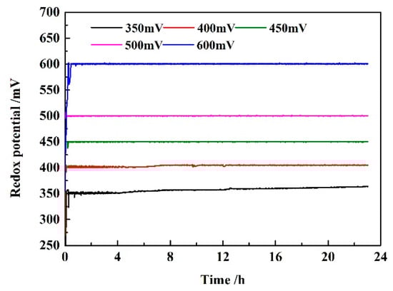 The redox potential controlling device, shown in Figure 2, was used to perform the leaching test of chalcopyrite at the redox potentials of 350 mV, 400 mV, 450 mV, 500 mV, and 600 mV. As shown in Figure 4, the redox potential was precisely controlled. When the target redox potential was 450 mV, 500 mV, and 600 mV, the ore sample was oxidized, resulting in a decreasing trend of the redox potential. Oxidizer was added to maintain the redox potential to the target value.