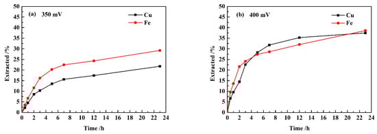 Figure 5 shows the test results of the redox potential fixed at 350 mV, 400 mV, 450mV, 500mV and 600 mV. At the redox potential of 400 mV, the leaching rates of Cu and Fe were the same (Figure 5b). However, at the lower potential of 350 mV and the higher potentials of 450 mV, 500 mV and 600 mV, the leaching rate of Fe was higher than Cu. In all the leaching tests, chalcopyrite was leaching at a faster rate at the beginning and then gradually slowed down. At the redox potential of 400 mV, chalcopyrite was leached at a faster rate before 7 h; however, after 7 h, the inhibition was more obvious, and the leaching almost stopped. The Cu leaching rate reached 32% at 7 h, and only 15% in the other experimental groups. However, at 23.5 h, the Cu leaching rate was only 37%.
