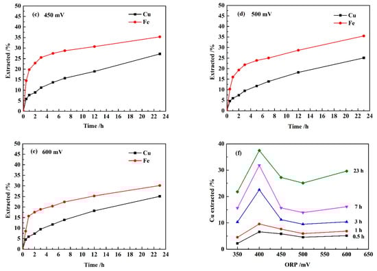 Figure 5. In the controlled redox potential test process, the redox potentials (ae) were fixed at 350 mV, 400 mV, 450 mV, 500 mV and 600 mV, respectively, showing the Cu and Fe leaching rates at different times; (f) Cu leaching rate at different redox potentials.