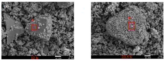 In the experimental group with redox potential fixed at 400 mV, Cu leaching rate was significantly different in the initial and later stages. Therefore, leaching residue at 12 h and 23.5 h were selected for SEM detection as shown in Figure 6a,b, and area A of the chalcopyrite surface and area B of the particles on the ore surface were selected for EDS detection.