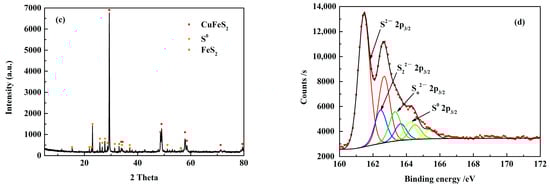 Figure 7. For the experimental group with a redox potential of 600 mV, solid phase SEM image (a), XRD image (b), and XPS image (c) at 23.5 h of chalcopyrite leaching. (C and D in the figure are EDS detection areas).