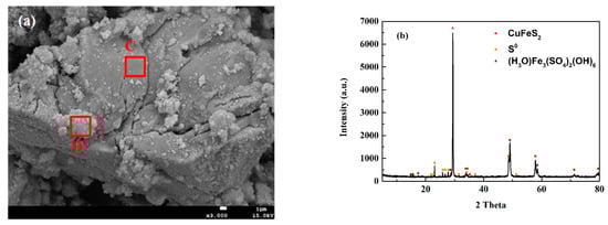 The EDS detection depth is 1–2 μm, and the particle size formed by the intermediate was 2 μm on average; thus, EDS detection could be used as the basis to judge the elements contained in the intermediate products. The results (Table 3) show that the particles formed by the intermediate products not only contain a large amount of S, but also Cu and Fe. The area A that is not covered by the intermediate is still the intrinsic chalcopyrite.