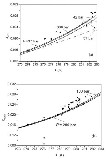 where means the partial molar volume of CO2 in aqueous solution, Psat is defined as the pressure required to obtain a given solubility, . At Psat, CO2-rich vapor (or liquid) coexists with H2O-rich liquid (aqueous phase) so that Psat can be calculated from CO2 solubility model developed by Duan et al. [101] for vapor–liquid equilibrium (VLE). in Equation (9) represents the fugacity of CO2 at Psat, which is calculated from the EOS of Duan et al. [102]. can be evaluated from PVTX and solubility data of the CO2-H2O system based on thermodynamic methods [103]. The value of determined by this study is equal to 31.5 cm3/mol at temperatures below 300 K.