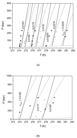 in Equation (6) is the difference of the molar volume between hydrate and liquid water. For sI hydrate, it equals to 4.6 cm3/mol after neglecting small variations of molar volumes of hydrate lattice and liquid water with pressure.