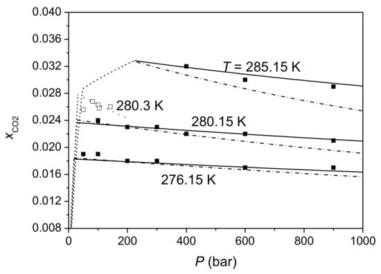 Calculations of models of Hashemi et al. [86], Zhang et al. [83], and Yang et al. [77] were put into Figure 1, Figure 2, Figure 3, respectively. It can be seen that models of Zhang et al. [83] and Yang et al. [77] give a negative pressure dependence of CO2 solubility at HLWE, which is consistent with our model. In contrast, the model of Hashemi et al. [86] gives a positive pressure dependence of CO2 solubility at HLWE. The model of Yang et al. [77] gives a greater decrease gradient of CO2 solubility with increasing pressure than our model using Method 2, while the decrease gradient of CO2 solubility with increasing pressure predicted by the model of Zhang et al. [83] is comparable to that predicted by our model with Method 2. As shown in Figure 1, calculations of the model of Hashemi et al. [86] are lower than experimental data at 37 bar and 42 bar. Calculations of the model of Yang et al. [77] agree with experimental data reported in the same work, but are larger than those measured by other studies. The accuracy of the model of Zhang et al. [83] is comparable to our model since it adopted solubility models [101,113,114] which can accurately calculate CO2 solubility at vapor–liquid equilibrium. However, the model of Zhang et al. [83] overestimates the occupancy fraction of CO2 in small cage. Considering that composition of CO2 hydrate phase at HLWVE calculated by Sun and Duan [18] is accurate and the variation of composition of CO2 hydrate phase with pressure is small, we argue that calculations of this model for composition of CO2 hydrate phase at HLWE are reliable. However, experimental data on composition of hydrate phase at HLWE are needed for verifying our model. In general, this model is generally more accurate than previous models in CO2 solubility in aqueous solutions and in composition of hydrate phase. In addition, this model covers a larger range of pressure (up to 1000 bar) compared to previous models.
