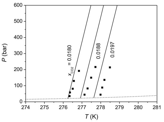 In contrast to numerous studies for three-phase equilibrium of CO2 hydrate, studies on CO2 hydrate–liquid water two-phase equilibrium are relatively limited. Aya et al. [76], Yang et al. [77], Lee et al. [78], Servio and Englezos [79], Zhang [80], Someya et al. [81], Kim et al. [82], Zhang et al. [83], Sun et al. [84], and Geng et al. [85] measured CO2 solubility in water at hydrate–liquid water equilibrium (HLWE). All measurements show that CO2 solubility at HLWE increase with increasing temperature. In regards to the effect of pressure, available experimental data show weak pressure dependence of CO2 solubility at HLWE although there are some discrepancies among them.