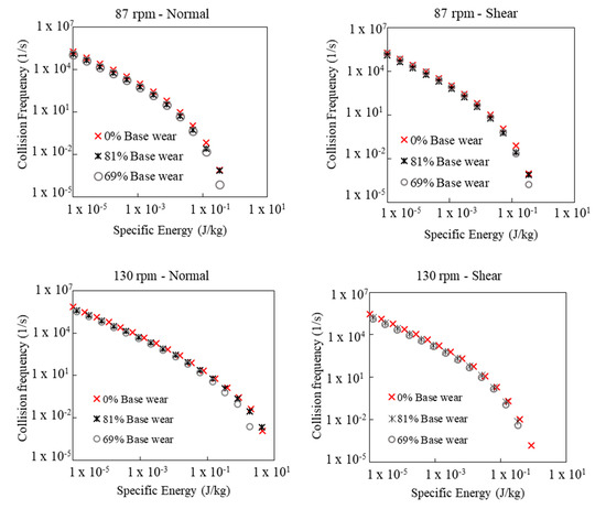 Figure 17 shows normal and shear energy spectrums for the three operational velocities, at different wear stages. By comparing shear (right) and normal (left) collision spectra, it is possible to note that normal contacts are more affected by wear. In this sense, a greater reduction in the collision frequency was observed for normal contacts, in comparison to shear. This reduction is emphasized at greater specific energies, especially above 1 × 10−1 J/kg. Based on the idea that collisions of greater specific energies can lead to an inefficient use of energy, it can be suggested that wear scenarios can be related to a better energy use behavior. This indicates that the agitator wear pattern affects mostly high energy contact, while maintaining low energy contacts that present a better energy efficiency behavior. However, it is important to emphasize that the collision frequency and energy reduction will probably generate a coarser product, and thus, the better energy use behavior will be mainly caused by the overall power consumption reduction. Recently, Oliveira [31] applied a mechanistical model to predict product size distribution by using the particle contact spectra obtained with DEM simulations. The simulation considered grinding media as the mill charge, in the absence of ore and slurry. By taking into consideration different proportions of shear power involved in inter particle collision, the model successfully predicted product size distribution of laboratory-scale experiment, for different solids concentration ratios. In this sense, this model can be applied to quantify the wear effect on product size distribution.