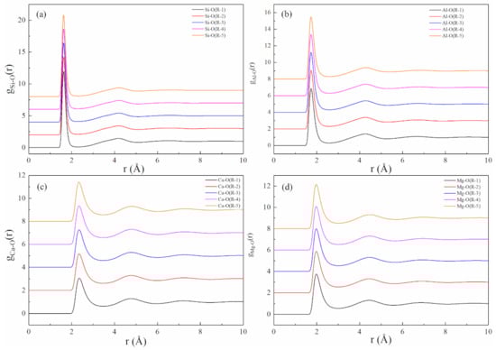 PDF of (a) Si-O, (b) Al-O, (c) Ca-O, and (d) Mg-O with various CaO/Al2O3 ratios.