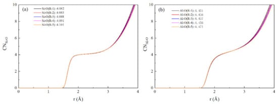 Figure 2 shows the curve of the coordination number of Si-O and Al-O at various CaO/Al2O3 ratios. The coordination numbers of Si-O or Al-O were determined based on the first minima of the corresponding PDF. The coordination numbers of Si-O and Al-O at various CaO/Al2O3 ratios were in the ranges of 4.082–4.101 and 4.451–4.471, respectively. Therefore, the coordination number of Si-O was closer to 4, indicating that most of the Si-O exists in a tetrahedral structure. The coordination number of Al-O was greater than 4, indicating that Al-O has a structure with multiple coordination numbers in the system. On increasing the CaO/Al2O3 ratio, the coordination number of Si-O slightly increased, indicating that the CaO/Al2O3 ratio slightly weakened the stability of the SiO4 tetrahedron.