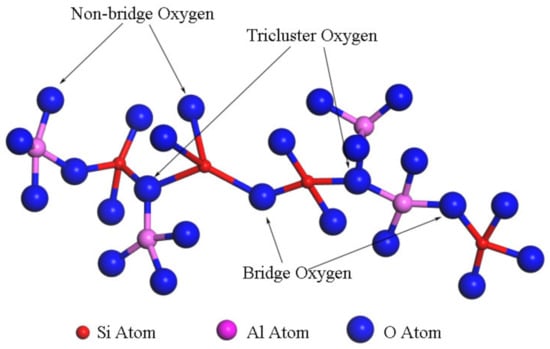 The microstructure of the refining slag is composed of network structure of three atoms: Si, Al, and O. The main structural units were SiO4 tetrahedron and AlO4 tetrahedron. Oxygen plays an important role in the micro network structure. Oxygen units can be mainly divided into four types: free oxygen (FO), non-bridging oxygen (NBO), bridging oxygen (BO), and tricluster oxygen (TO) [32,33]. Illustrations of the different oxygen units are shown in Figure 3. FO does not participate in the formation of a tetrahedral structure and is freely present in the network structure. NBO exists at the corners of the tetrahedral structure, and only connects one Si or Al atom. BO connects two tetrahedrons, and acts as a connection point, including three types: Si-O-Si, Si-O-Al, and Al-O-Al. The higher the BO content, the more tetrahedrons are connected together, and the greater of degree of polymerization (DOP). TO is oxygen that connects three tetrahedral structures and can be divided into four forms: OSSS, OSSA, OSAA, and OAAA. The higher the content of TO, the more complex the structure of the system.