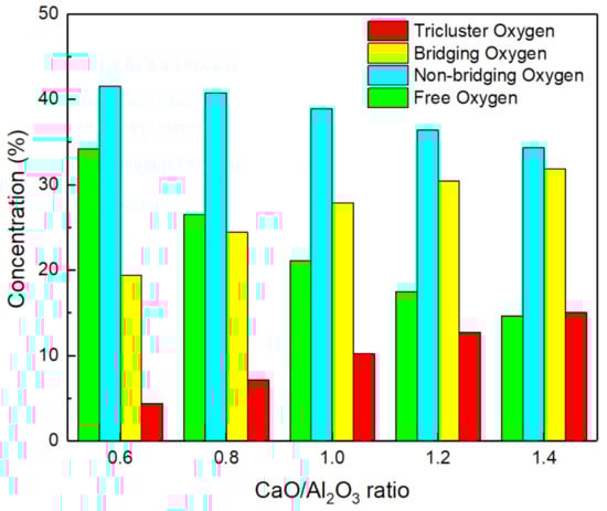 Figure 4 shows the evolution of different oxygen units with various CaO/Al2O3 ratios. The increase of the CaO/Al2O3 ratio caused a decrease of FO and NBO content, and an increase of BO and TO content. Therefore, higher CaO/Al2O3 ratio promoted the conversion of FO and NBO to BO and TO. The CaO/Al2O3 ratio increased the complexity of the system, thereby increasing the degree of polymerization of the system.