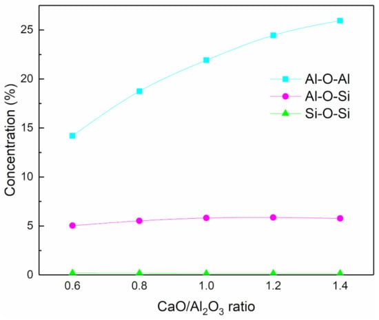 Here, BO are grouped into three types namely: Al-O-Al, Al-O-Si, and Si-O-Si. The specific evolution is shown in the Figure 5. The content of Al-O-Si and Si-O-Si remained basically constant, and the content of Al-O-Al increased at higher CaO/Al2O3 ratios. The reason for this is that the SiO2 content remains constant in all systems. The increase of the CaO/Al2O3 ratio provides more charge compensation for Al3+ ions, which leads to more Al2O3 participating in the construction of the network structure.