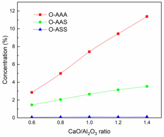 In this paper, TO only has three forms of O-AAA, O-AAS, and O-ASS. The specific variation is shown in Figure 6. Because the SiO2 content is relatively small, no O-SSS TO appeared in this research system. From the results in the figure, it indicated that as the CaO/Al2O3 ratio was increased, the O-ASS content of two SiO4 tetrahedron does not change. The O-AAS and O-AAA content showed an upward trend, and the O-AAS content with SiO4 tetrahedron participation increased more slowly. Thus, the presence of SiO4 slightly prevented Al2O3 from forming TO. When only Al2O3 was present in the system, the TO of the system increased rapidly as the CaO/Al2O3 ratio was increased.