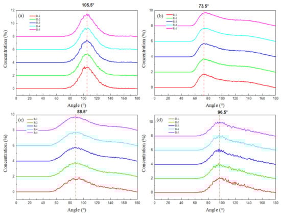 Previous studies have identified aluminosilicates are composed of microscopic network structures with the three elements of Si, Al, and O as connection points. To clarify the microstructural composition of the system, the distribution of bond angles is shown in Figure 9. Because the bonds formed by Ca, Mg, and O are generally ionic bonds, the bond angles of Ca, Mg, and O are not analyzed. Through the analysis of the previous chapters, it has been proved that the microstructural units in aluminosilicate are mainly SiO4 and AlO4. As can be seen from Figure 9a, the bond angles of O-Si-O are mainly distributed around 105.5°, whereas the bond angle O-X-O of a standard tetrahedron is 109°. The reason for this effect is a small content of structures other than SiO4 in the microstructural unit composed of Si. However, the SiO4 tetrahedral structure was the most stable in the aluminosilicate melt. As observed from Figure 9b, the O-Al-O bond angles were distributed in the range of 73.5° and greater. This is because of the existence of multiple types of Al-O coordination. Hence, the Al-O structure unit is unstable. As can be seen from Figure 9c,d, the bond angles of Al-O-Al and Al-O-Si are distributed around 88.5° and 96.5°, respectively. In summary, the change of CaO/Al2O3 ratio does not change the bond angles of the microstructure of the system.