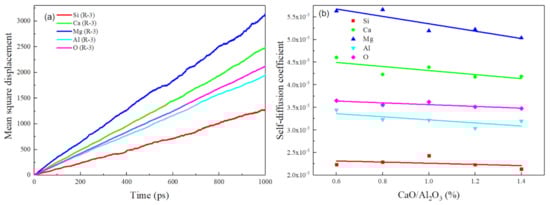 The variation of the MSD of each element indicated that the system was in a molten state. Changes of the atoms in the five sets of simulations were basically similar, only the MSD of R-3 is shown in Figure 10a. Through variation of the MSD, the diffusion capacity of different elements decreased in the order: Mg > Ca > O > Al > Si. Mg and Ca only formed ionic bonds with O. Therefore, the diffusion capacities of Mg and Ca atoms were the highest. The atomic radius of Mg was smaller than that of Ca, such that the diffusion capacity of Mg was highest. Because of the nature of SiO4 and AlO4 structure units in the aluminosilicate, the diffusion capacities of Si, Al, and O are ranked lower. In general, the diffusion capacity of O ranked between that of Si and Al. However, in this system, the high content of FO gave a diffusion capacity of O that is markedly higher than that of Al and Si. Because SiO4 tetrahedron are more stable, the diffusion capacity of Al is higher than that of Si.