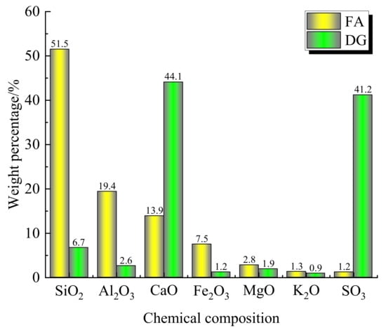 The chemical composition of both FA and DG was tested by using the sequential X-ray fluorescence spectrometer from the University of Science and Technology Beijing, Beijing, China. The basic parameter including scanning velocity, voltage, and current were 300/min, 60 kV, and 140 mA, respectively. The X-ray fluorescence spectrometry was conducted to investigate the chemical composition of tested mine specimens in this study. The cement composition of FA and DG materials were listed in Figure 2.