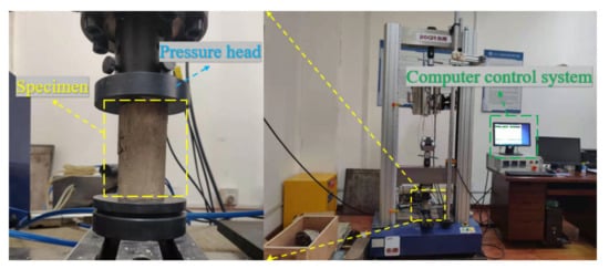 In this study, the both ends of the tested mine fill specimens’ sections were polished to ensure flatness. As shown in Figure 4, the uniaxial compressive tests were performed to obtain their uniaxial compressive strength (UCS). The wdwi-100 loading system of the Materials Center of the University of Science and Technology Beijing (Beijing) was used for UCS testing. The loading rate was set as a fixed speed of 1 mm/min. To reduce the test errors, each group of uniaxial compression tests contained three specimens to obtain the mean UCS values for the final evaluation. The experimental data could be recorded and stored in the computer during the whole loading process.