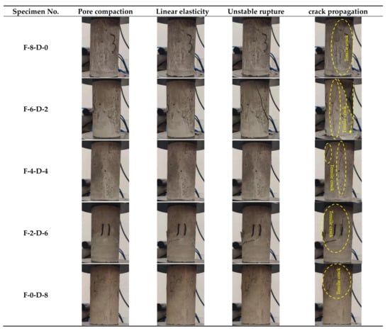 In general, the stress–strain curves can divide into four stages: (1) Pore compaction stage: there would be lots of pores in the tested specimens due to FA and DG particles. These pores would be compacted when the pressure increased during this stage, resulting in a concave stress–strain curve. (2) Linear elastic stage: the strain also increased with the pressure increased. Thus, the curve became a straight line. (3) Unstable rupture stage: the elastic deformation turned into plastic deformation during this stage. The UCS values gradually reached their peak with cracks growth. (4) Crack propagation stage: after the samples reached their peak, as the pressure increased, the samples’ crack expanded until samples was failed. It was also found that the F-6-D-2 and F-4-D-4 tested specimens showed strong brittleness after UCS reached the peak values. However, the UCS values of F-8-D-0, F-2-D-6, and F-0-D-8 tested mine backfill specimens were not so large. The specimens showed a good ductility after reaching their UCS values.