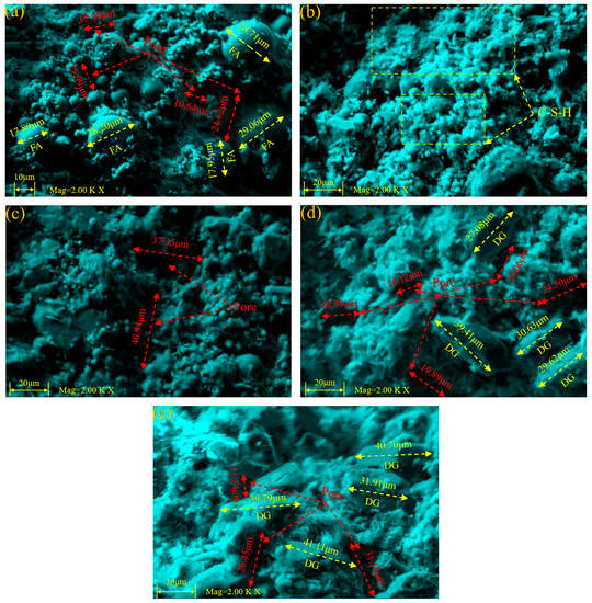 Figure 11 shows that SEM images of tested mine backfill samples with five different solid waste ratios when the curing time was 7 days. The ImageJ software was used to explore the microstructure of the tested backfill samples. Figure 11a shows the microstructural diagram of the F-8-D-0 samples. It was found that there were many large-size particles of FA on the sample’s surface. There were also many pores on the tested specimen’s surface. Moreover, the maximum particle size of FA and the largest pore size were 29.06 μm and 24.62 μm, respectively. It was also found from Figure 11b that a large amount of hydration products including calcium silicate hydrate (C-S-H), and few pores appeared on the solid-phase particles’ surface. Moreover, the surface of the F-6-D-2 sample was much denser than other mine fill samples in this study. As shown in Figure 11c, lots of large-size pores existed on the F-4-D-4 sample’s surface, and the maximum size reached 40.94 μm. Moreover, there were still lots of large-particle DG pieces and pores on the surface of the F-2-D-6 and F-0-D-8 mine fill samples, as demonstrated in Figure 11d,e.