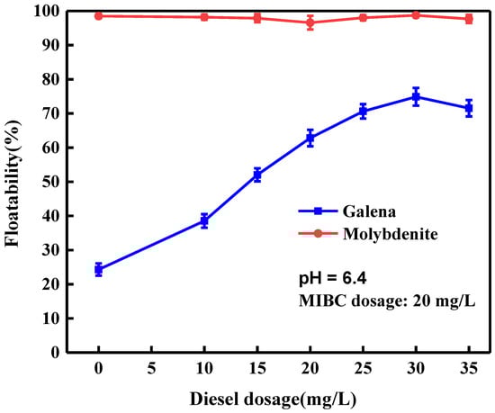 Floatability of galena and molybdenite as a function of diesel dosage.