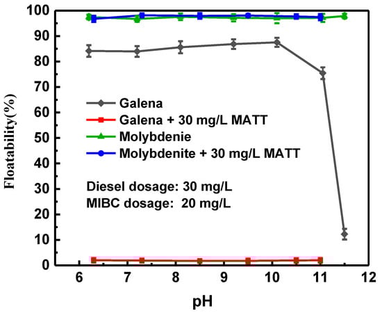 Figure 4 shows the effect of the pulp pH on the floatability of galena and molybdenite in the absence and presence of MATT. Molybdenite had a good floatability with or without MATT in the whole testing pH range of 6.0–11.0. The recovery of molybdenite was maintained at 98% under varied pH conditions. However, the pH significantly influenced the floatability of galena. As shown in Figure 4, galena exhibited a very low floatability when the pH value was greater than 10.0 without MATT due to the formation of hydroxyl species, which made galena surface hydrophilic [20,21]. The addition of MATT led to a very strong depressing effect on galena, only less than 2% galena was floated, whereas the floatability of molybdenite barely changed in the presence of MATT. In addition, it could be observed that galena was strongly depressed within a board pH range, which suggested that MATT could realize the selective separation of molybdenite and galena and have a good application prospect.