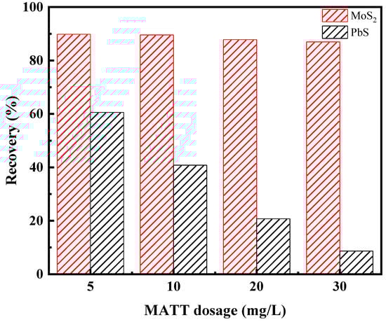 The flotation tests of artificially mixed minerals were carried out to further examine the effect of MATT on the flotation separation of galena and molybdenite. Figure 5 shows the flotation separation results of artificially mixed minerals at pH 9.0. The recovery of PbS decreased with the increase of MATT dosage, and the recovery of galena reduced to around 8.6% when MATT dosage reached to 30 mg/L. For the case of molybdenite, the recovery of MoS2 still maintained at 88.9% as the increase of MATT dosage, which was in a good accordance with the results of single mineral flotation. The flotation separation results of artificially mixed minerals reconfirmed that MATT could selectively separate galena from molybdenite.