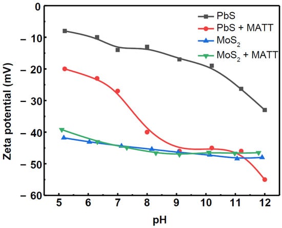 The zeta potentials of galena, MATT-treated galena, molybdenite and MATT-treated molybdenite are presented in Figure 6. The decrease of PbS zeta potential at pH less than 5 was ascribed to the formation of sulphoxy species due to oxidation of PbS, whereas lead hydroxyl species were identified as the most likely candidates accounting for the behavior under alkaline conditions according to previous reports [20].