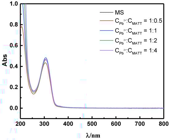 The UV-Visible spectroscopy was employed to identify the stoichiometric ratio of lead ion and reagent using a Cary 60 UV-Vis spectrophotometer (Agilent, Santa Clara, CA, USA). The Pb2+ solution was mixed with MATT solutions at pH 6 with different concentration, and then the solution was stirred for 20 min to make sure the reaction was completed. The mixture was stood for 24 h. After that, the supernatant was transferred to quartz utensil and the absorbance was measured within the range of 200 to 800 nm.