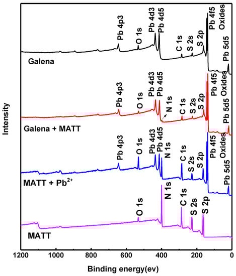 The survey XPS spectra of galena treated at various conditions are shown in Figure 8. For galena treated by MATT, a new peak appeared at about 399.0 eV, which was the characteristic peak of N 1s. The surface atomic content of C, N, O, S and Pb atoms were presented in Table 1. The concentration of N atoms on the surface of galena treated with MATT increased by 2.98%. It could be inferred from those results that MATT was effectively adsorbed on the galena surface, because MATT was the unique source of N element, which was in agreement with the result of zeta potential.