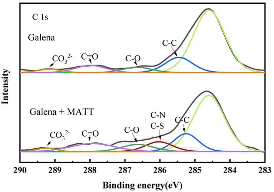 The C 1s spectra of galena and galena treated with MATT are shown in Figure 9. The peak located at 284.60 eV was represented as the referenced C 1s. For galena, the spectra of 285.46 eV, 286.47 eV, and 287.76 eV would be attributed to C–C, C–O, and C=O respectively [18]. The peak at 289.16 eV was assigned to the lead carbonate (PbCO3) [22,23,24], due to the oxidation on galena surface. As for the spectra of galena treated with MATT, a new peak increased at 285.50 eV (–C–N and –C–S group) [25,26] appeared, which reconfirmed that MATT could be adsorbed on the surface of galena.