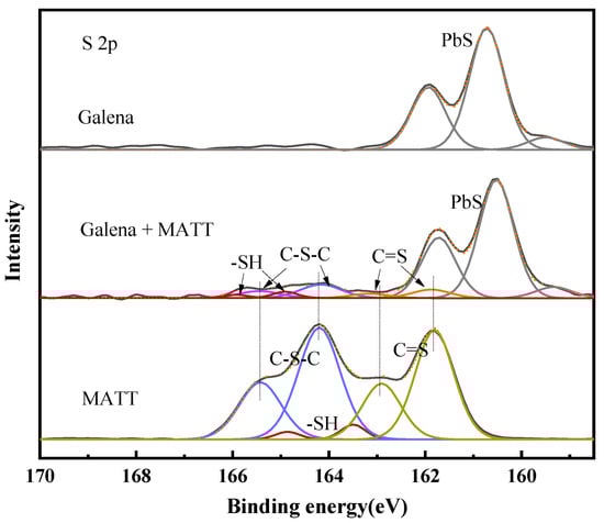 The S 2p spectra of galena, galena treated with MATT and MATT are shown in Figure 10. Obviously, the peaks located at 160.71 and 161.92 eV were the characteristic doublet peak of galena, which was consistent with those in previous reports [17]. The S 2p spectra of the depressant could be deconvoluted into three peaks at 161.82 eV, 163.68 eV and 164.26 eV, which represented C=S (tautomer form of –N=C–SH), –SH and C–S–C (from 1,3,4-thiadiazole group) respectively [27]. It should be noted that the peaks of the thiol group shifted to a higher binding energy significantly after the adsorption of MATT, while there was no obvious displacement that occurred to doublets of C=S and C–S–C, thus indicating that the sulfur atom from the thiol group might act as the reaction site when the depressant was adsorbed on the surface of galena.