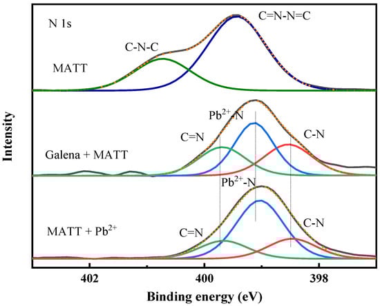 Figure 11 shows the N 1s spectra of galena, galena treated with MATT and MATT treated with Pb2+ ions. As shown in Figure 11, the spectra of MATT could be fitted with two components at 399.42 and 400.48 eV, which might be associated with C–N–C, C=N–N=C, or C=N–N–C, respectively [28,29]. From the survey spectra of galena, there was no characteristic peak on the surface of galena. After the addition of MATT depressant, three new peaks increased at 398.54 eV, 399.12 eV and 399.69 eV, which were very similar to the spectra of MATT treated with Pb2+ ions. The peaks at 398.54 eV and 399.69 eV could be assigned to C–N and C=N [30,31], whereas the peak centered at 399.12 might be ascribed to the Pb–N bond caused by the adsorption, proving that the nitrogen atom might also participate in the chemisorption.