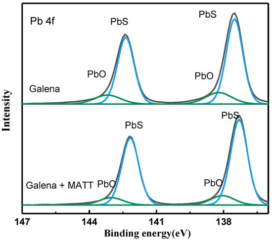 The high resolution spectra of Pb 4f of galena treated and untreated with MATT is displayed in Figure 12. For the original galena sample, the Pb 4f spectra located at 137.50 eV and 142.50 eV were regarded as the characteristic peaks of galena and were coherent with the reported values in previous study [32], while the binding energy located at 138.45 eV and 143.45 eV were due to oxidation products of lead ions on galena surface. After the addition of MATT depressant, the binding energy of PbS was shifted to 137.29 eV and 142.18 eV, lower than that of original galena, while the spectra of Pb oxidizations were still at 138.42 eV and 143.42 eV. The decrease of Pb 4f binding energy demonstrated that the electronic density of lead atom was changed, which might be attributed to the combination of Pb sites and MATT.