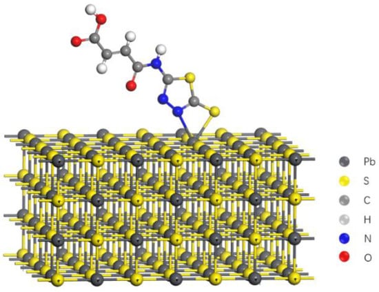 These analysis results mentioned above approved that the sulfur atom (-SH), the nitrogen atom from 1,3,4-thiadiazole group, and the lead atom from galena surface played as reaction sites. Therefore, a potential adsorption mechanism might be drawn from former tests that four member rings could be formed on the galena surface through MATT and the lead atom. The potential adsorption model of MATT on the galena surface was proposed as shown in Figure 13, which was in agreement with the adsorption mechanism of CSC-1 (collector) [33] on the galena surface.