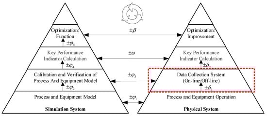 Figure 1 shows a multi-layered development model proposed for the implementation of optimization functionality in a crushing plant []. Various individual research has been performed at different levels of the model presented. For instance, equipment modelling [,,], process modelling [,], data collection [,], performance calculation [] and process optimization methods [,,,,,]. The decision-making process is based on both plant operational data as well as the results from plant simulation. For such multi-layered implementation of optimization functionality, reliable underlying systems (measurement system, models, etc.) are needed. Based on the choice in the underlying systems, each development stage inherits certain accuracy indicated by its total relative errors (φi, δi, ω, β) [].