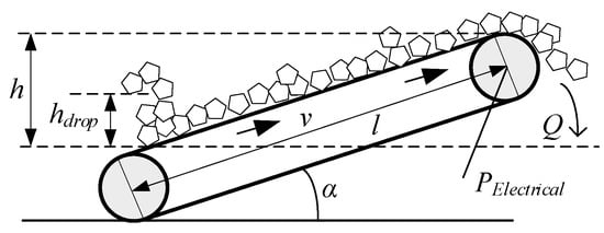 The power draw from a conveyor belt is dependent on the load on the conveyor, the conveyor speed, geometrical design, and the overall efficiency of the conveyor. The working principle of the power-based belt scale is based on equating the mechanical power required to lift the material to a certain height to the corresponding electrical power consumed by the conveyor. A detailed description of the power-based belt scale can be found in Hulthén and Evertsson [] and of underlying mechanical principles in Morin [], while a summary is presented here. Figure 2 presents the working principle of conveyor lifting material and the geometrical properties of the conveyor.