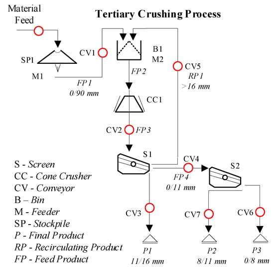 The crushing plant layout used in this research is presented in Figure 3, which is a tertiary stage of a three-stage aggregate production plant. The crushing plant is operated by NCC Industry and is situated at Uddevalla, Sweden. The material from the stockpile (SP1) is supplied to the feeder (M1) to the process, which fills up the bin (B1) located before the crusher (CC1—HP4 Crusher). The crusher output is screened by two screens (S1 and S2) located sequentially, producing three products (P1, P2 and P3) and one recirculated product (RP1). The crusher and screens are connected using belt conveyors (CV1 to CV7). Each equipment data stream, for example, power draw, machine settings, are centrally connected to the cloud solution []. The data captured are typically recorded at a frequency of 0.1–0.2 Hz. As the process is being operated, the values of the mass flow change with respect to machine settings, material properties, wear, etc. Table 2 presents the list of various mass measuring units present in the crushing circuit. As presented, the conveyors CV1 and CV2 are equipped with the belt scale to measure the mass flow while the conveyors CV3 and CV7 rely on power-based belt scales that are calibrated by physical measurement of the mass using a front loader. The conveyor CV4, CV5 and CV6 are also power-based belt scale and are calibrated using mass balancing equations for the circuit.
