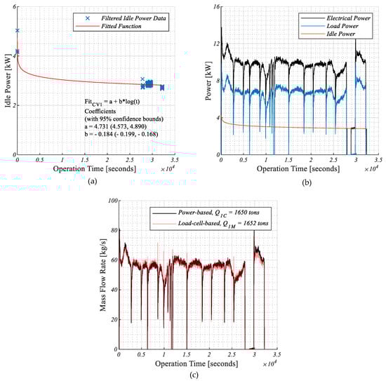 The conveyor CV1 and CV2 are calibrated against the reference data of the load-cell-based belt scale. The stepwise calibration process for CV1 is presented in Figure 4. The idle power data is filtered from the recorded electrical power signal using a data-filtering algorithm. The idle power data set is used to fit the logarithmic function as shown in Figure 4a. The fitted function is used to estimate the idle power for the entire day of operation. The recorded electrical power signal and the calculated load power signal are shown in Figure 4b. Likewise, the load powers for all conveyors are calculated. The load-cell-based reference mass flow data and the calibrated power-based mass flow is shown in Figure 4c. Similarly, the conveyor CV2 is calibrated.