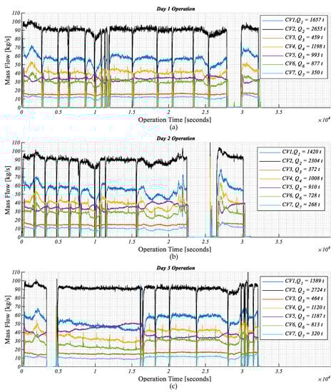 The mass flow recorded from different conveyors for Day 1, 2 and 3 is presented in Figure 5 respectively. Day 1 data (Figure 5a) is used to calibrate the efficiencies of the conveyors while Day 2 and Day 3 data (Figure 5b,c) are used to validate the working of the power-based belt scale. The total accumulated mass for each conveyor is also displayed. It can be noted that there are observable drifts in the mass flow recording on Day 3 which is be related to the crusher operation with regards to the control system.