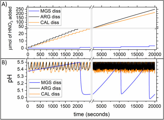 (A) μmol of HNO3 added during the dissolution of magnesite (MGS), aragonite (ARG) and calcite (CAL). (B) pH cycles during carbonate dissolution. The grey areas are used to highlight the presence of breaks in the axes.