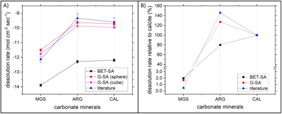 (A) Dissolution rates of MGS, ARG and CAL normalized by the surface area. Two geometrical surface areas are reported (sphere and cube approximations) together with BET surface area and literature values [30,31,32]. (B) Dissolution rate of MGS and ARG normalized with respect to CAL.