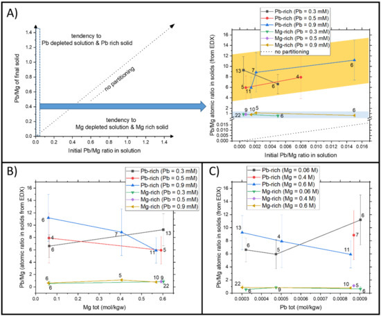 (A) Composition of the solid phase as a function of the Pb/Mg ratio in the initial solution. The plot on the left shows the range of compositions investigated and the plot on the right shows the preferential incorporation of Pb in the solid phases. (B) Composition of the solid phases as a function of the initial total magnesium content. (C) Composition of the solid phases as a function of total lead content. The numbers next to the symbols refer to the number of independent EDX analyses used to calculate the averages and the standard deviations.