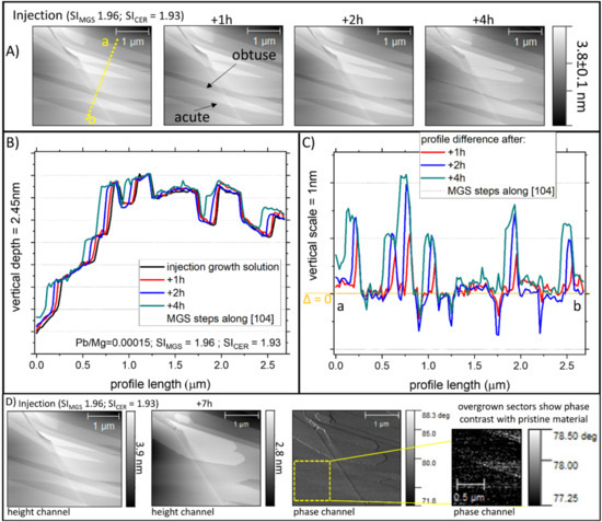 The favourable incorporation of Pb2+ in the solid phase, during co-precipitation experiments in the Mg-PbII-CO2-H2O system, motivates the study of the effect that the presence of Pb2+ has on MGS growth. A suitable technique to investigate this effect is in situ AFM [38]. We compare the spreading rate of the step edges on the {10.4} surfaces of MGS during interaction with a growth solution with or without Pb2+. The growth of MGS in supersaturated solution at 25 °C is a process so slow that it is hard to visualize even with AFM. The observed step advancement rate in pure Mg-CO2-H2O is in the order of picometers per second (0.001 nm/sec). In the presence of Pb2+, a tenfold increase in the spreading rate of the obtuse step edges was observed (0.010 ± 0.003 nm/sec). The evolution of the surface topography of MGS {10.4} surfaces shows the advancement of the obtuse step edges (Figure 6A). By comparing the section profiles of images recorded at different times, it is possible to quantify the movement of the step edges. The only mathematical adjustment on the profiles is an offset to match the position and the height of the section maximum (Figure 6B). The difference between the initial profile and the actual profile can be calculated to determine the overgrown region during the time lapse between the two frames (Figure 6C). It is interesting to notice that the advancement of the acute step is so small that it does not significantly affect the alignment of the profiles extracted from different frames. This is reflected in the maintenance of the alignment on the right side of the steps, i.e., the acute steps (Figure 6B). The error on the advancement rate of the obtuse step due to the advancement of acute steps can be inferred by the relative half peak broadness of positive (overgrowth along the obtuse step) and negative (uncertainty due to acute step advancement) peaks. The broadness ratio is about 20%, thus smaller than the standard deviation of repeated measurements that is about 30% (0.010 ± 0.003 nm/sec). An important insight into the growth mechanism of MGS in the presence of Pb2+ is provided by the analysis of the phase channel, which is sensitive to variations in the composition of the material [39,40]. An accurate observation of the phase channel on a step that grew in the presence of Pb2+ (Figure 6D) shows the presence of a phase contrast with the pristine MGS steps. This evidence points toward the incorporation of Pb2+ in the obtuse steps of MGS. The strong difference in the reactivity of acute and obtuse steps also agrees with the evidence that Pb2+ is significantly greater than Mg2+ [41]. The size of Pb2+ makes it prone to interact with the region that presents a minor steric hindrance, thus the obtuse rather than acute step.