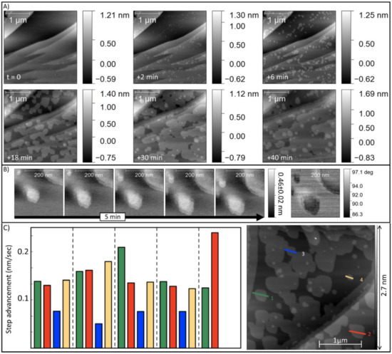 (A) Sequence of height channel images recorded onto a {10.4} MGS surface after the injection of a supersaturation solution analogous to Figure 6, but after ageing. (B) Height channel images at high magnification of few nuclei that grow during 5 min. (C) Step propagation rates calculated from the time-resolved size increment of the four particles shown on the right side. The colours of the lines and the columns link every particle with its step advancement rate.