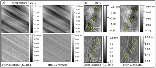 In situ observation of {10.4} surfaces of MGS in contact with acidic solution, pH 4 (HNO3). The images were acquired in tapping mode. The first row corresponds to height channels, while the second row reports the respective amplitude channels. (A) The dissolution at 25 °C is sluggish and it is not possible to detect any dissolution feature. (B) In the same conditions but at higher temperature (60 °C), dissolution features are observed on the {10.4} surfaces of MGS, despite the retrograde solubility. Yellow and blue lines of constant size are used to highlight the evolution of etch pits and step edges, respectively. This evidence demonstrates that the existence of kinetic barriers controls the dissolution of MGS at room temperature conditions.