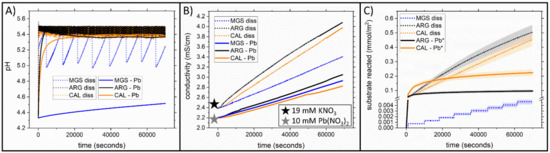 (A) Comparison between the evolution of pH in dissolution and recrystallization experiments for MGS, ARG and CAL. (B) Evolution of electrical conductivity in absence and in presence of Pb2+. The star symbols refer to the conductivity of the respective solution calculated with PHREEQC. (C) Comparison between the amount of substrate that reacted during the dissolution of MGS, ARG and CAL and the amount of substrate reacted during the batch recrystallization experiments in presence of Pb2+. The experiments labelled with the asterisk (in Figure 9C) refer to literature values from [9].