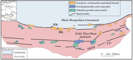 - Baatar, M.; Ochir, G.; Kynicky, J.; Iizumi, S.; Comin-Chiaramonti, P. Some notes on the Lugiin Gol, Mushgai Khudag and Bayan Khoshu alkaline complexes, Southern Mongolia. Int. J. Geosci. 2013, 4, 1200–1214. [Google Scholar] [CrossRef]