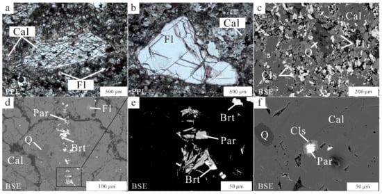 Transmitted plane-polarized light and back-scattered electron photomicrographs illustrating the key petrographic features of carbonatite and calcite. (a) Euhedral coarse-grained calcite (Cal) with jagged grain boundaries associated with fine-grained calcite and purple fluorite (Fl); (b) coarse-grained fluorite associated with fine-grained calcite; (c) calcite, fluorite, celestine (Cls) with accessory quartz; (d,e) barite (Brt) associated with quartz and parasite (Par) disseminated in calcite; (f) parasite together with celestine occurring as inclusions in calcite.